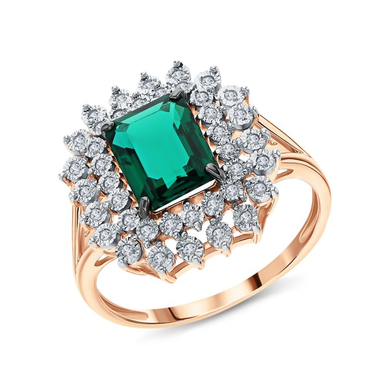 Кольцо с 40 бриллиантами природными, 0.138 карат, огранка круг 17 граней, цвет 2, чистота 2, тип огранки А; 1 гидротермальным изумрудом, 1.934 карат; Розовое и белое золото 585 пробы.