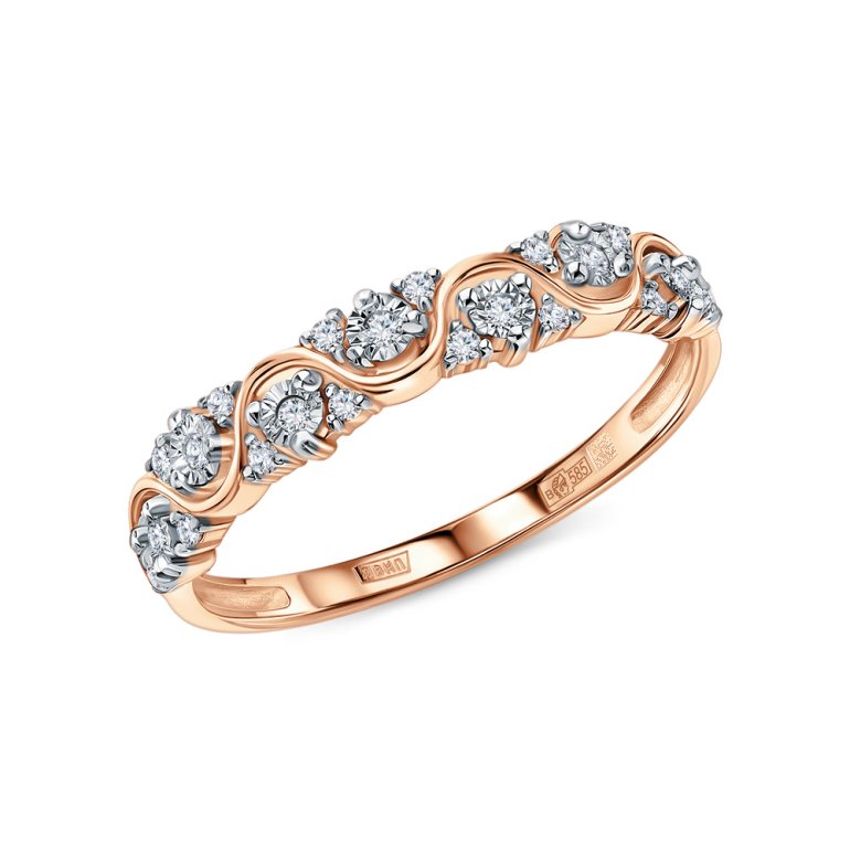 Кольцо с 21 бриллиантом природным, 0.092 карат, огранка круг 17 граней, цвет 2, чистота 2, тип огранки А; Розовое и белое золото 585 пробы.