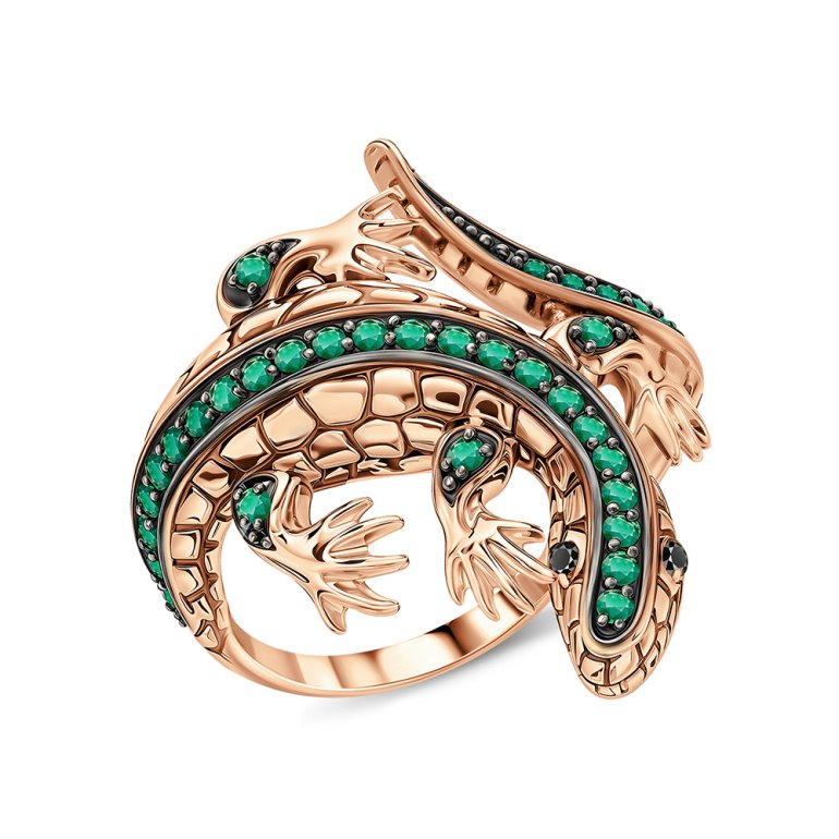 Кольцо с 2 бриллиантами черными природными облагороженными, 0.017 карат, огранка круг 57 граней, цвет 7, чистота 6, тип огранки А; 34 изумрудами природными, 0.222 карат, цвет 3, чистота 3, тип огранки В; Розовое золото 585 пробы.