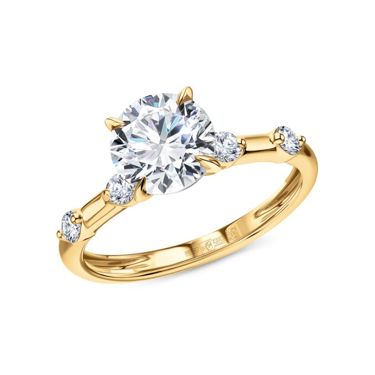 Кольцо с 1 бриллиантом выращенным, 1.56 карат, огранка круг 57 граней, цвет 4, чистота 5, тип огранки В; 4 бриллиантами выращенными, 0.189 карат, огранка круг 57 граней, цвет 3, чистота 5, тип огранки В; Желтое золото 585 пробы.