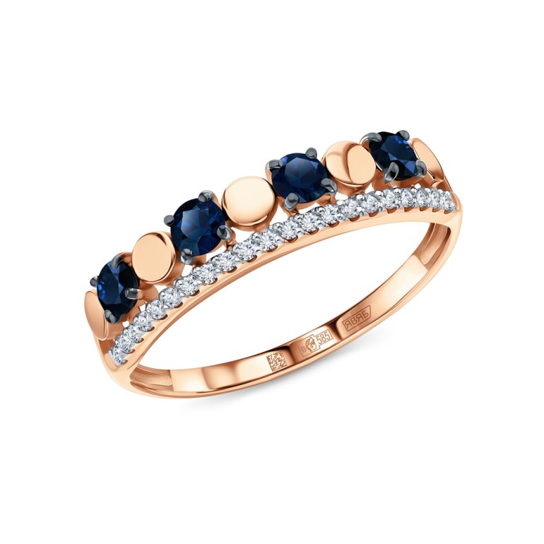 Кольцо с 21 бриллиантом природным, 0.075 карат, огранка круг 17 граней, цвет 2, чистота 2, тип огранки А; 4 сапфирами природными, 0.37 карат, цвет 2, чистота 2, тип огранки В; Розовое золото 585 пробы.