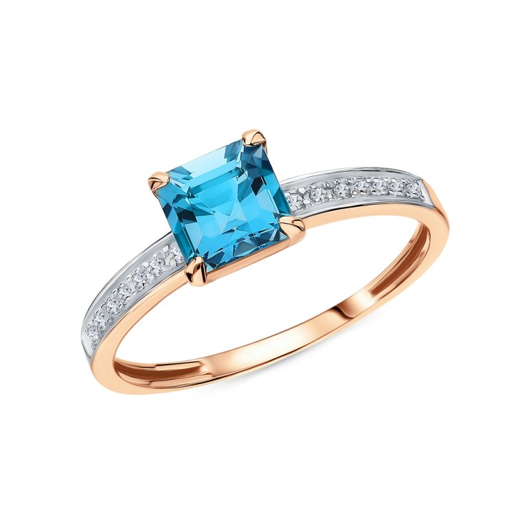 Кольцо с 14 бриллиантами природными, 0.03 карат, огранка круг 17 граней, цвет 2, чистота 2; 1 топазом свисс природным, 0.683 карат; Розовое золото 585 пробы.