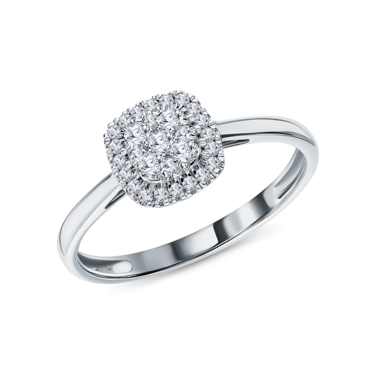 Кольцо с 5 бриллиантами природными, 0.123 карат, огранка круг 57 граней, цвет 3, чистота 6; 24 бриллиантами природными, 0.084 карат, огранка круг 17 граней, цвет 2, чистота 2; Белое золото 585 пробы.