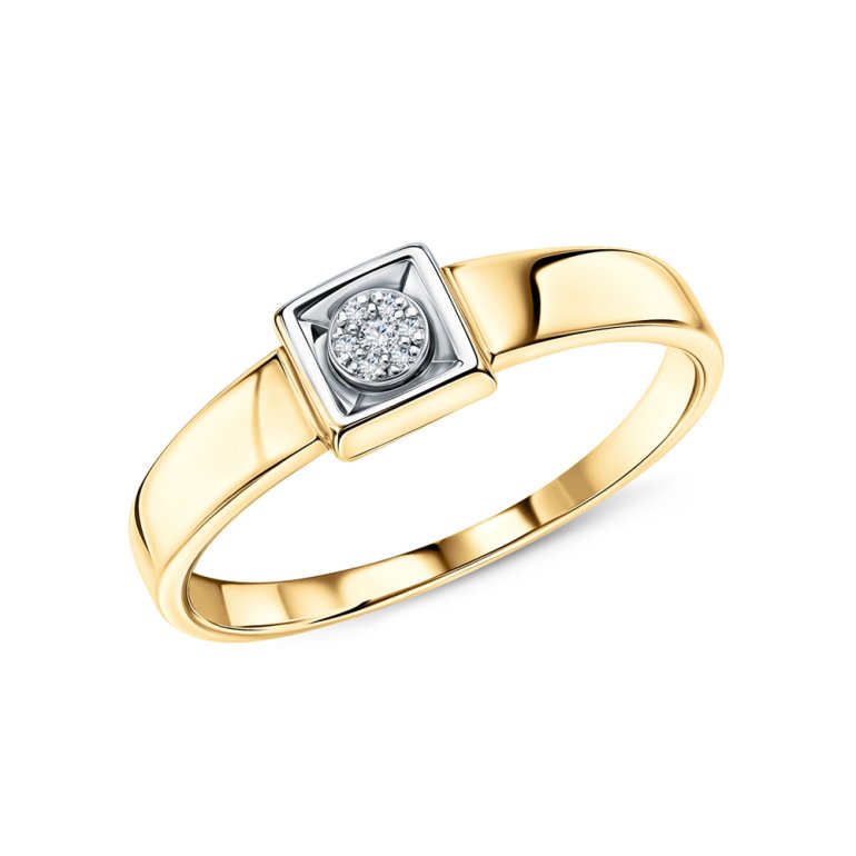 Кольцо с 1 бриллиантом природным, 0.007 карат, огранка круг 57 граней, цвет 3, чистота 6, тип огранки А; 6 бриллиантами природными, 0.011 карат, огранка круг 17 граней, цвет 2, чистота 2, тип огранки А; Желтое и белое золото 585 пробы.