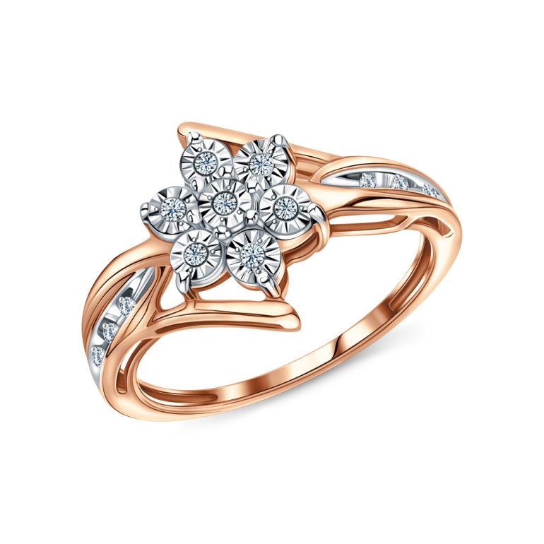 Кольцо с 7 бриллиантами природными, 0.034 карат, огранка круг 17 граней, цвет 2, чистота 2, тип огранки Б; 6 бриллиантами природными, 0.018 карат, огранка круг 17 граней, цвет 2, чистота 2, тип огранки Б; Розовое и белое золото 585 пробы.