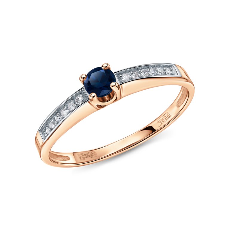 Кольцо с 12 бриллиантами природными, 0.049 карат, огранка круг 17 граней, цвет 2, чистота 2; 1 сапфиром природным, 0.185 карат, цвет 2, чистота 2; Розовое золото 585 пробы.