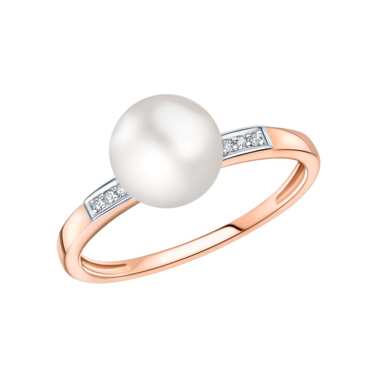 Кольцо с 6 бриллиантами природными, 0.021 карат, огранка круг 17 граней, цвет 2, чистота 2, тип огранки А; 1 жемчугом пресноводным культивированным белым; Розовое золото 585 пробы.