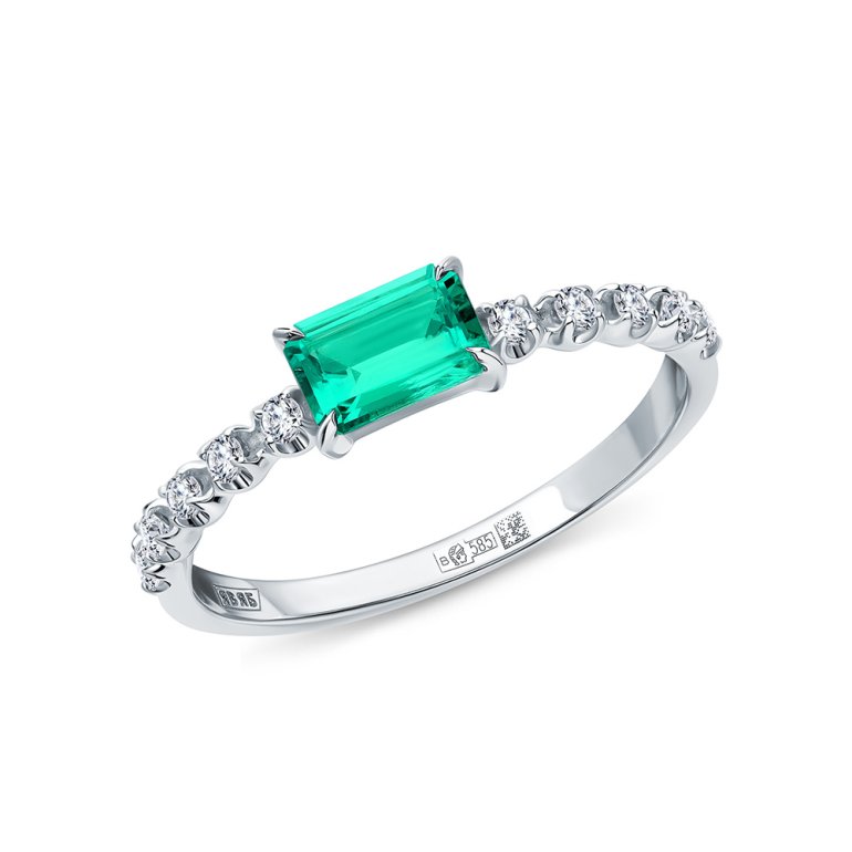 Кольцо с 1 изумрудом выращенным Колумбия, 0.453 карат; 1 изумрудом выращенным Колумбия, 0.453 карат; 10 бриллиантами выращенными, 0.136 карат, огранка круг 57 граней, цвет 3, чистота 5, тип огранки А; 10 бриллиантами выращенными, 0.136 карат, огранка круг 57 граней, цвет 3, чистота 5, тип огранки А; Белое золото 585 пробы.