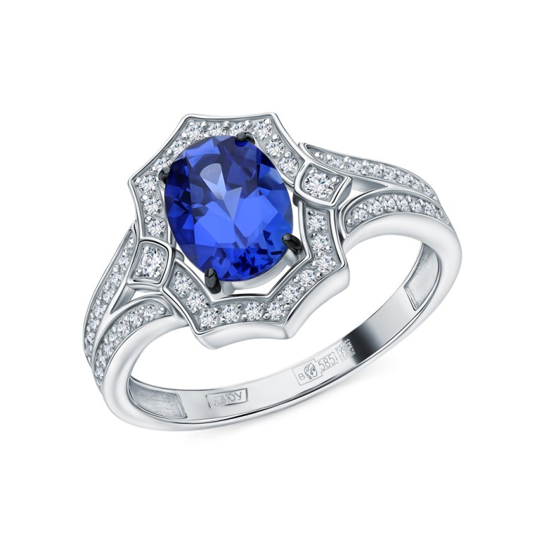 Кольцо с 2 бриллиантами природными, 0.028 карат, огранка круг 57 граней, цвет 3, чистота 6, тип огранки А; 54 бриллиантами природными, 0.216 карат, огранка круг 17 граней, цвет 2, чистота 2, тип огранки А; 4 бриллиантами природными, 0.008 карат, огранка круг 17 граней, цвет 2, чистота 2, тип огранки А; 1 сапфиром выращенным, 1.57 карат; Белое золото 585 пробы.
