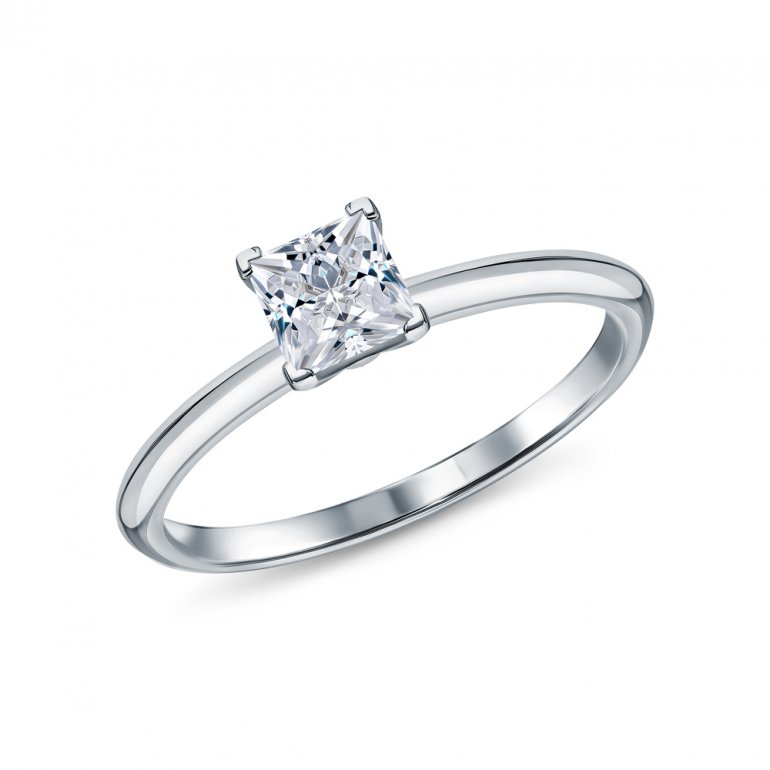 Кольцо с 1 бриллиантом природным, 0.5 карат, огранка принцесса 65 граней, цвет 4, чистота 6, тип огранки А; Белое золото 585 пробы.