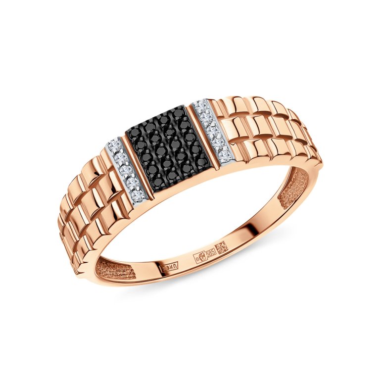 Кольцо с 10 бриллиантами природными, 0.041 карат, огранка круг 17 граней, цвет 2, чистота 2, тип огранки А; 20 бриллиантами черными природными облагороженными, 0.087 карат, огранка круг 57 граней, цвет 7, чистота 6, тип огранки А; Розовое золото 585 пробы.
