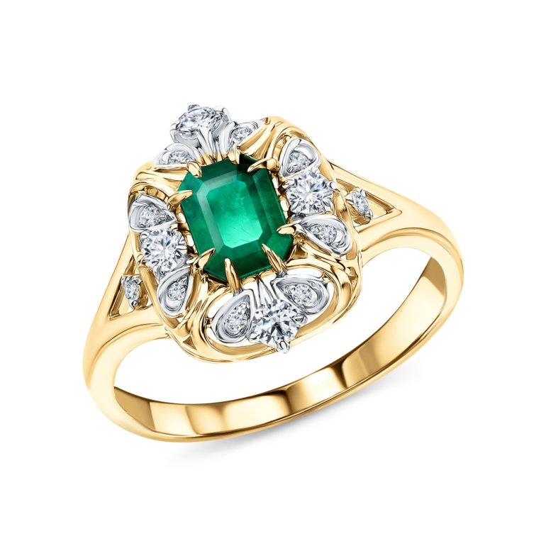Кольцо с 4 бриллиантами природными, 0.224 карат, огранка круг 57 граней, цвет 3, чистота 6; 2 бриллиантами природными, 0.024 карат, огранка круг 57 граней, цвет 3, чистота 6; 8 бриллиантами природными, 0.052 карат, огранка круг 57 граней, цвет 3, чистота 6; 1 изумрудом природным, 0.831 карат, цвет 3, чистота 3; Желтое золото 585 пробы.
