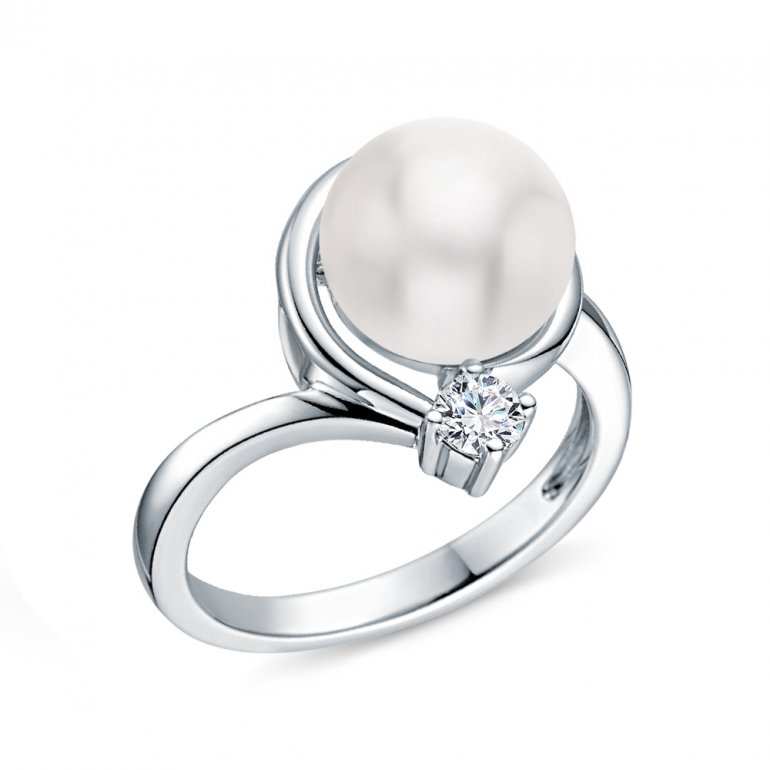 Кольцо, вставка: фианитом бесцветным;  жемчуг пресноводный культивированный белый; Серебро 925 пробы.