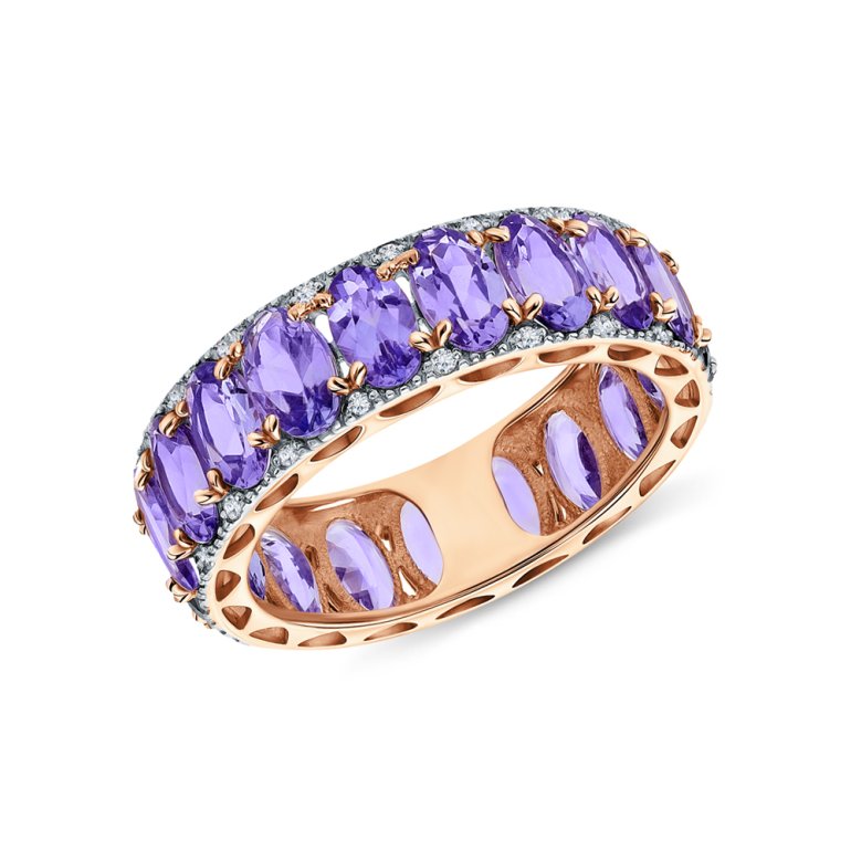 Кольцо с 38 бриллиантами природными, 0.111 карат, огранка круг 17 граней, цвет 2, чистота 2, тип огранки Б; 19 танзанитами природными, 4.438 карат; Розовое золото 585 пробы.