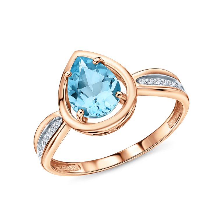 Кольцо с 14 бриллиантами природными, 0.064 карат, огранка круг 17 граней, цвет 2, чистота 2; 1 топазом скай природным, 1.225 карат; Розовое золото 585 пробы.