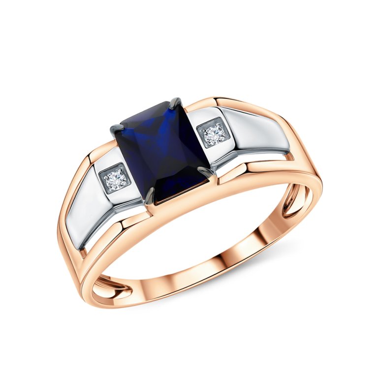 Кольцо с 2 бриллиантами природными, 0.037 карат, огранка круг 57 граней, цвет 3, чистота 6, тип огранки А; 1 сапфиром синтетическим, 1.824 карат; Розовое золото 585 пробы.