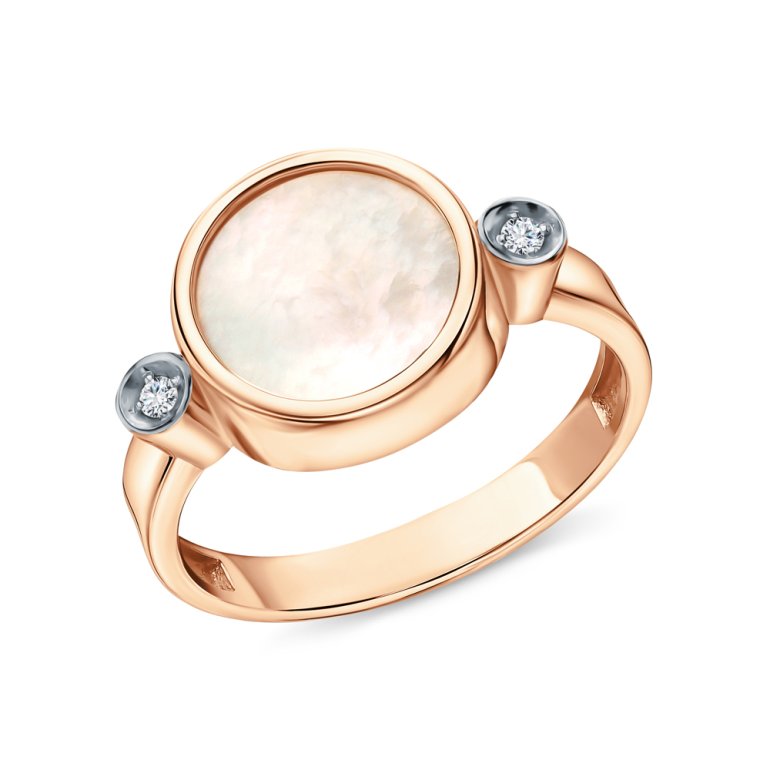 Кольцо с 2 бриллиантами природными, 0.028 карат, огранка круг 17 граней, цвет 2, чистота 2, тип огранки А; 1 перламутром белым природным, 1.107 карат; Розовое золото 585 пробы.