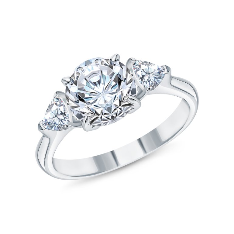 Кольцо с 1 бриллиантом выращенным, 2.06 карат, огранка круг 57 граней, цвет 4, чистота 5, тип огранки А; 2 бриллиантами выращенными, 0.356 карат, цвет 3, чистота 5, тип огранки А; Белое золото 585 пробы.