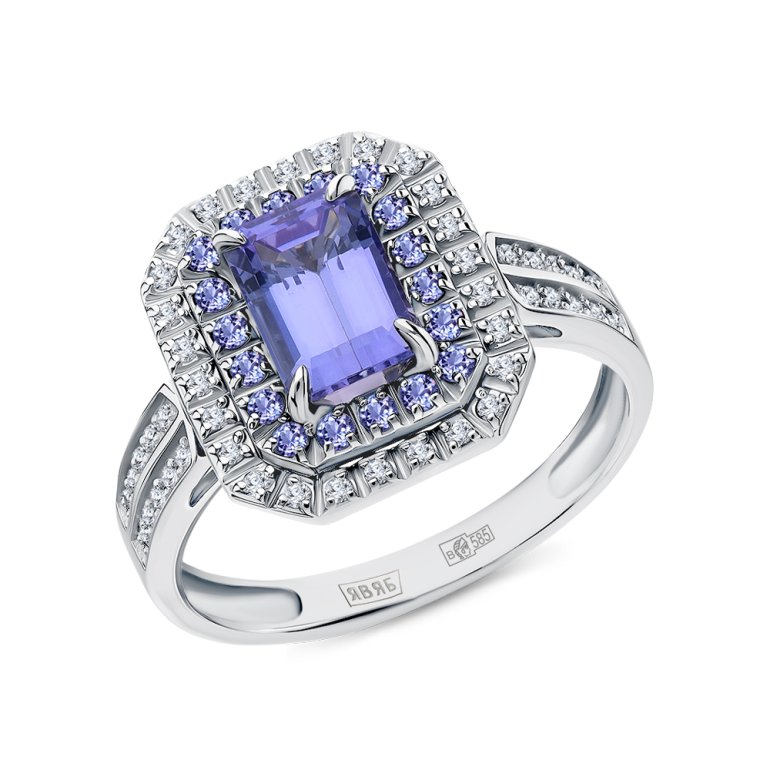 Кольцо с 46 бриллиантами природными, 0.158 карат, огранка круг 17 граней, цвет 2, чистота 2, тип огранки А; 1 танзанитом природным, 1.162 карат; 18 танзанитами природными, 0.169 карат; Белое золото 585 пробы.