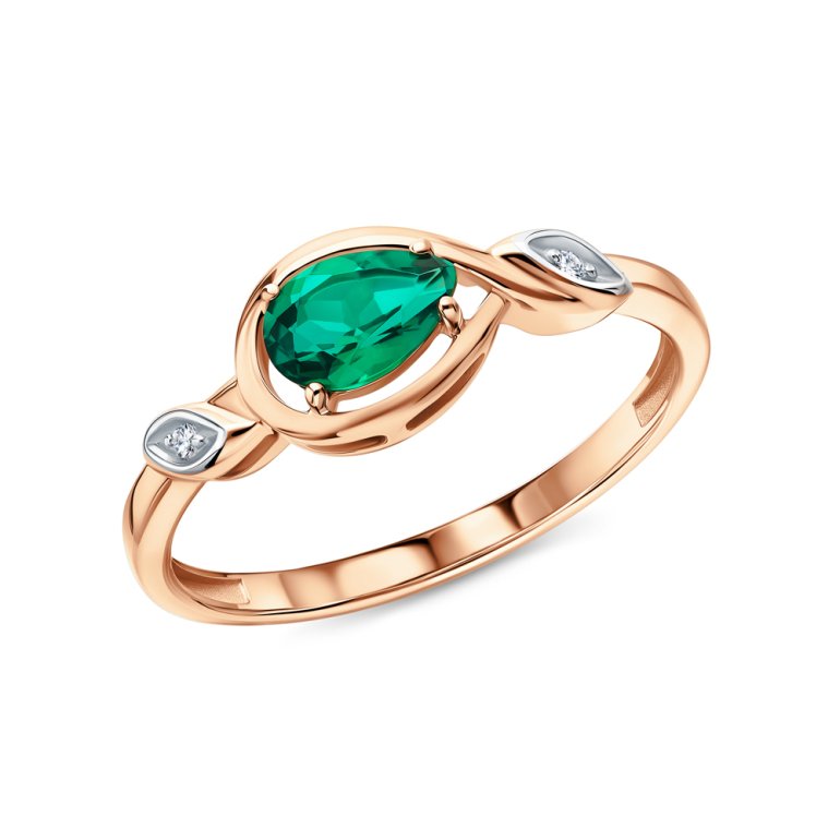 Кольцо с 2 бриллиантами природными, 0.009 карат, огранка круг 17 граней, цвет 2, чистота 2; 1 гидротермальным изумрудом, 0.37 карат; Розовое золото 585 пробы.