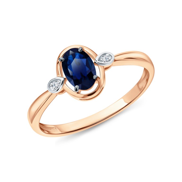 Кольцо с 2 бриллиантами природными, 0.009 карат, огранка круг 17 граней, цвет 2, чистота 2; 1 сапфиром синтетическим, 0.515 карат; Розовое золото 585 пробы.