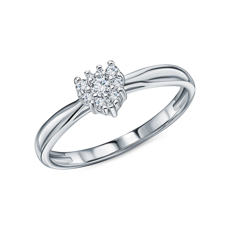 Кольцо с 1 бриллиантом природным, 0.044 карат, огранка круг 57 граней, цвет 3, чистота 6, тип огранки А; 2 бриллиантами природными, 0.026 карат, огранка круг 57 граней, цвет 3, чистота 6, тип огранки А; 4 бриллиантами природными, 0.034 карат, огранка круг 57 граней, цвет 3, чистота 6, тип огранки А; 1 бриллиантом природным, 0.003 карат, огранка круг 17 граней, цвет 2, чистота 2, тип огранки А; 2 бриллиантами природными, 0.005 карат, огранка круг 17 граней, цвет 2, чистота 2, тип огранки А; Белое золото 585 пробы.