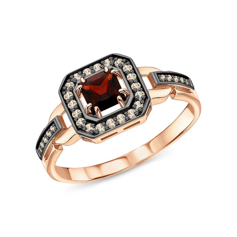 Кольцо с 1 гранатом природным, 0.429 карат; 20 бриллиантами коньячными природными, 0.068 карат, огранка круг 57 граней, цвет 7, чистота 5, тип огранки А; 10 бриллиантами коньячными природными, 0.024 карат, огранка круг 57 граней, цвет 7, чистота 5, тип огранки А; Розовое золото 585 пробы.