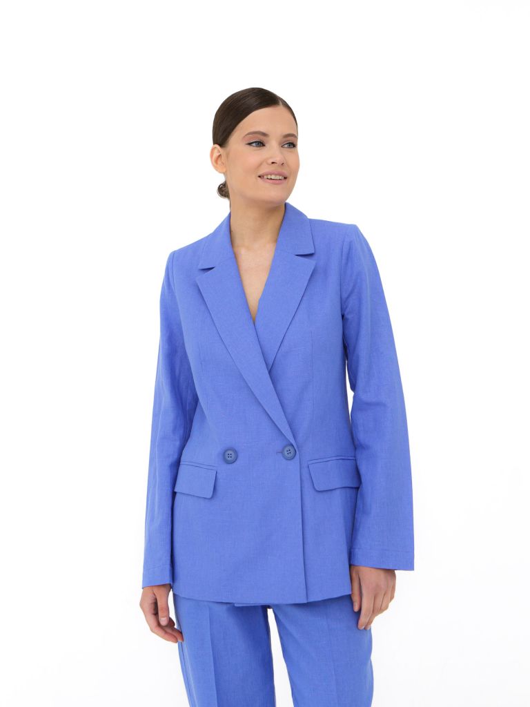 Жакет из льна и хлопка цвета василек — стильное и практичное решение для теплого времени года. Материал сочетает в себе легкость льна и мягкость хлопка, обеспечивая комфорт и воздухопроницаемость. Жакет имеет двубортную застежку, классические лацканы и накладные карманы, создавая элегантный силуэт. Этот яркий оттенок добавит изюминку любому образу, подходя как для деловых встреч, так и для повседневных прогулок