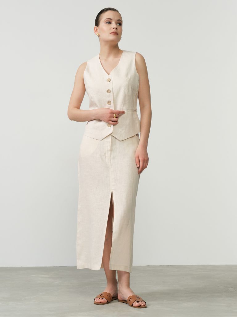 Бежевый льняной жилет — изысканный элемент гардероба, который сочетает в себе комфорт и элегантность. Выполненный из 100% натурального льна, он обеспечивает отличную вентиляцию и легкость, что делает его идеальным выбором для теплых дней. Жилет имеет прямой крой и аккуратную застежку на пуговицы, что добавляет ему универсальности и подходит как для деловых встреч, так и для повседневного ношения. Этот жилет легко комбинируется с различными видами одежды, от юбок до брюк, создавая стильные и элегантные образы.