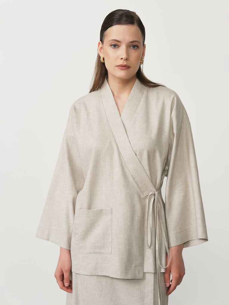 Льняной жакет-кимоно бежевого цвета — изящный и универсальный предмет гардероба, идеально подходящий для теплого сезона. Натуральный лен обеспечивает легкость и комфорт, позволяя коже дышать, а свободный крой и широкий пояс создают гармоничный и стильный силуэт. Широкие рукава добавляют образу нотку восточного шарма, делая этот жакет прекрасным выбором для создания стильных повседневных и деловых комплектов. Лен с его характерной фактурой создает особый эстетический эффект, подчеркивая природную красоту материала. С каждой ноской лен становится только мягче и приятнее к телу, сохраняя при этом структуру и благородный вид.