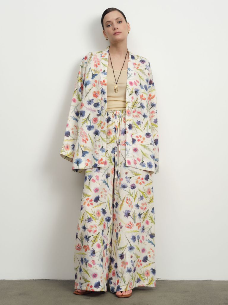 Жакет-кимоно льняное с цветочным принтом – восточная поэзия в современном гардеробеЛегкий жакет в стиле кимоно из натурального льна с нежным цветочным принтом – идеальный акцент для романтичных образов. Свободный крой и струящаяся фактура создают ощущение воздушности, а изящный рисунок добавляет нотку восточного шарма.Стилевые сочетания:• С белым льняным сарафаном – летний шик• К джинсовым шортам и топу – городской бохо• С шелковым платьем-комбинацией – вечерний вариантЭтот жакет-кимоно – как ветерок в жаркий день: дарит прохладу и восхищенные взгляды.