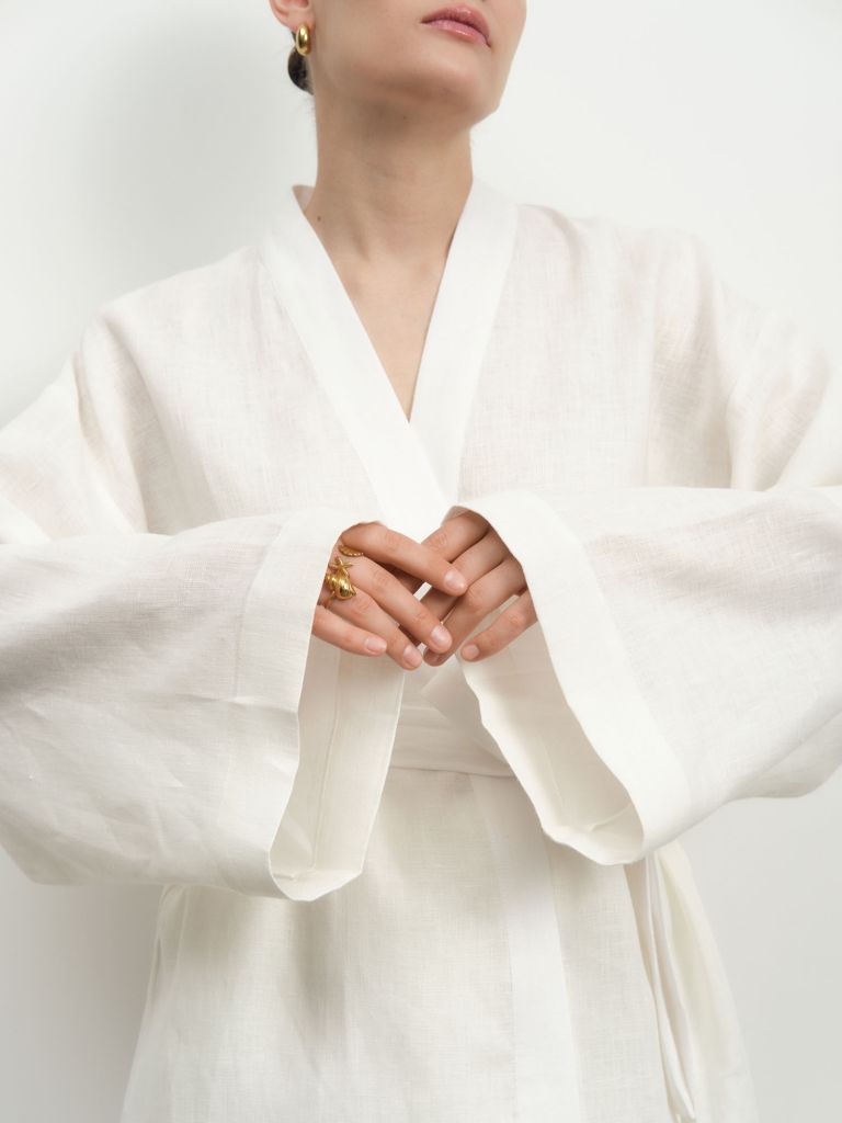 Жакет-кимоно льняное белое – эфирная легкость и универсальностьБелоснежный жакет в стиле кимоно из натурального льна – воплощение свежести и стиля. Идеальный летний аксессуар, который добавит образу воздушности и элегантной небрежности.С чем носить:- С купальником и шляпой – пляжный образ- К шелковому платью – вечерний вариант- С джинсами и топом – городской casualБелое кимоно – как облако легкости в вашем гардеробе.