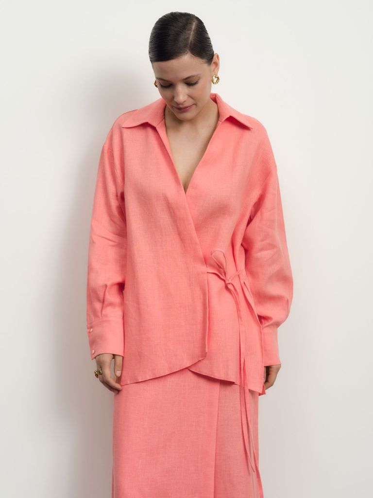 Рубашка льняная коралловая – нежность и стиль в каждой деталиЭлегантная льняная рубашка нежного кораллового оттенка – идеальный вариант для теплого сезона. Свободный крой и натуральный материал обеспечивают комфорт, а романтичный цвет добавляет образу женственности и свежести.Стильные сочетания:• С белыми льняными брюками• В паре с джинсовой юбкой-миди• Под пояс поверх платья-сарафана• С кремовыми шортамиДобавьте нотку романтики в свой гардероб – коралловая рубашка станет вашей любимой вещью этим летом!