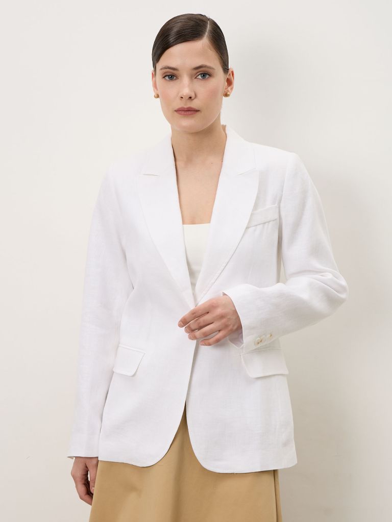Жакет легко вписывается в летний гардероб. Сочетайте его с льняными брюками, юбками или джинсами. В паре со светлыми оттенками образ получается свежим и цельным, с контрастным низом — более графичным. Хорошо работает как верхний слой в тёплую погоду.