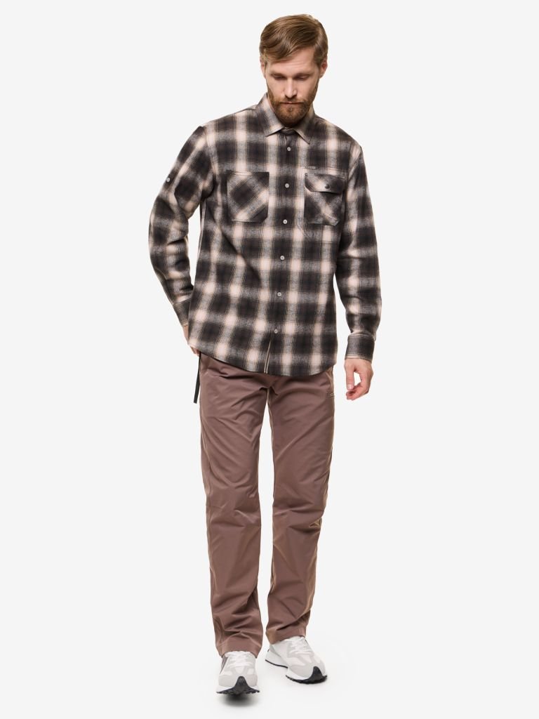 Мужская рубашка в клетку выполнена из фланелевой ткани. Хлопок 70%. Классический свободный крой. Два накладных кармана, один с клапаном на кнопке и кармашком для ручки. Внутренний карман из сетки на молнии. Рубашка застегивается на пуговицы. Манжеты рукавов на кнопках. Специальная пата фиксирует рукав в закатанном виде.