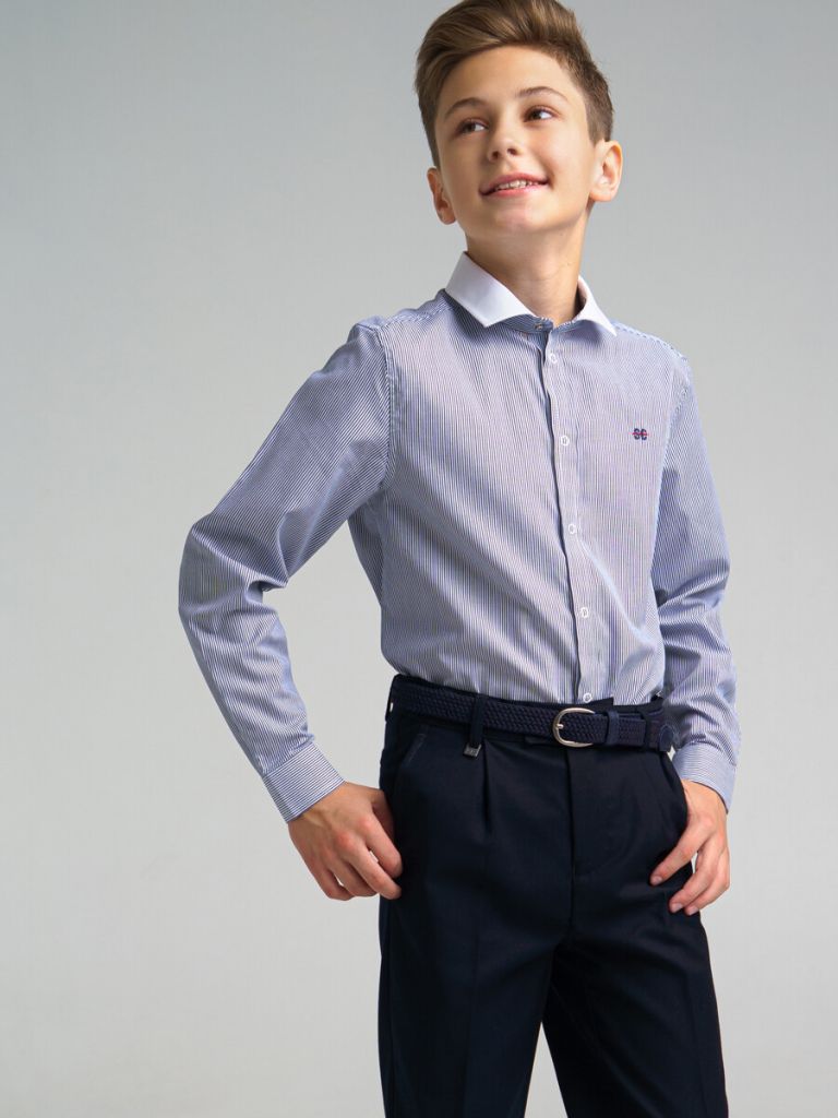 Синяя школьная рубашка с длинным рукавом и контрастным воротником - настоящая база гардероба для школьника! Классическая рубашка выполнена из ткани с высоким содержанием хлопка, что обеспечивает максимальный комфорт для мальчика подростка во время занятий. Рубашка классического силуэта на кнопках станет отличным решением для школы, как на каждый день, так и для торжественных случаев. Сорочка может быть дополнена стильным галстуком или бабочкой для создания завершенного образа в школу. Строгая, лаконичная, элегантная рубашка создаст ребенку учебный настрой.