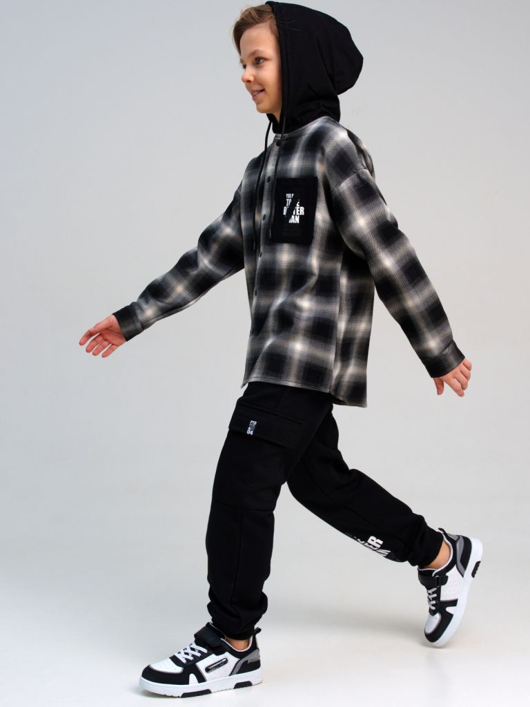 Фланелевая рубашка для мальчика подростка. Оверсайз силуэт. Застежка на кнопки. Капюшон с утяжкой шнурком. Функциональный нагрудный карман.
