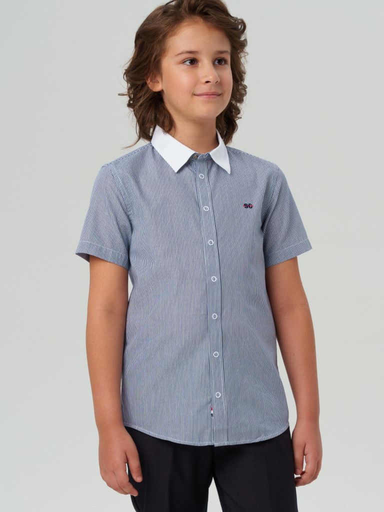 Темно-синяя полосатая рубашка с коротким рукавом для мальчика от бренда PlayToday — базовая вещь, без которой не обойтись в школьном гардеробе подростка.