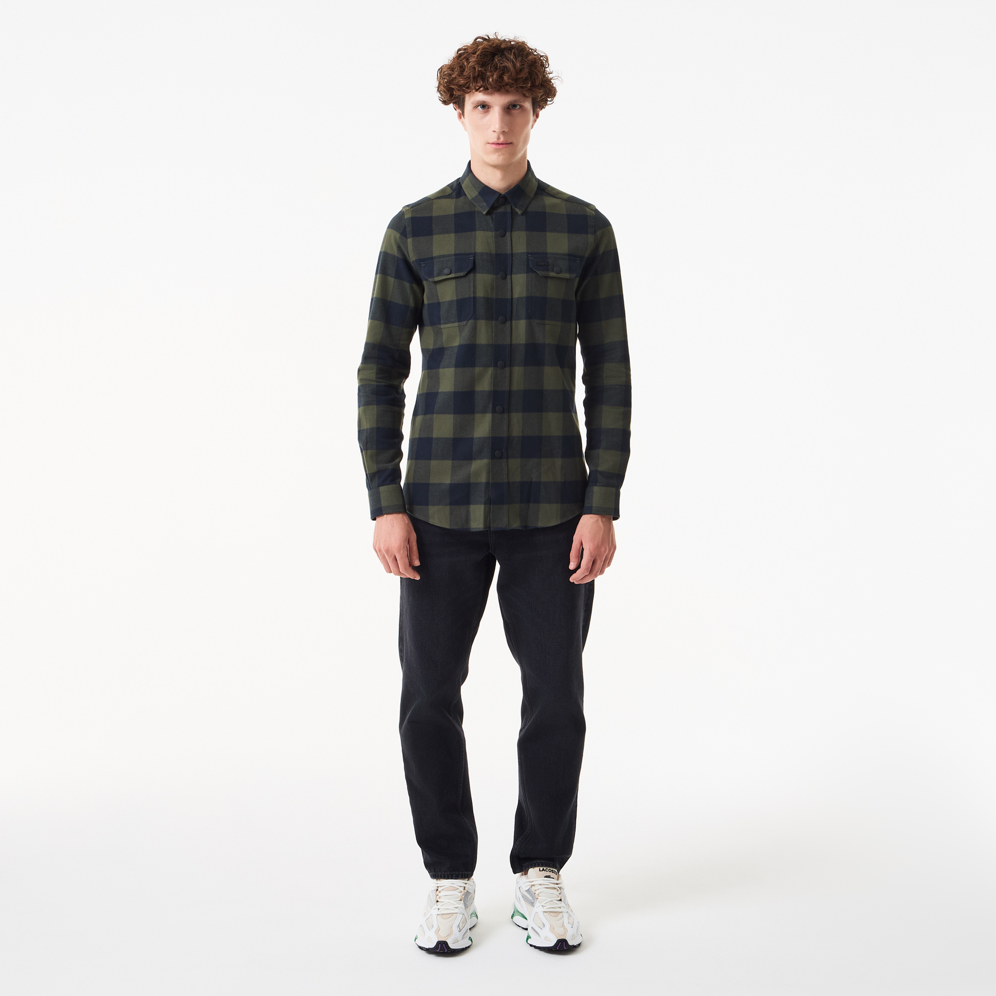 классический воротник\На кнопках\В клетку\Накладные карманы на груди\Логотип в тон изделия на груди\Материал: 100% хлопок\Рост модели 185 см, размер одежды 4-M