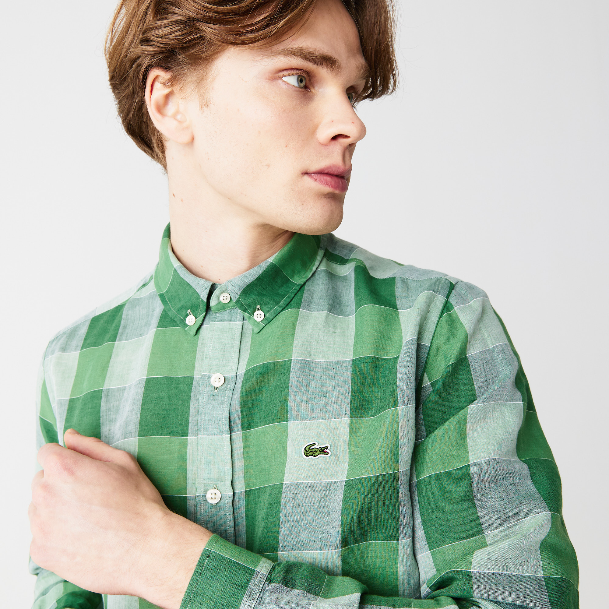 Воротник button-down;\В полоску;\Вышитый логотип Lacoste на груди\Материал: 67% лен 33% хлопок\Рост модели 185 см, размер одежды 4