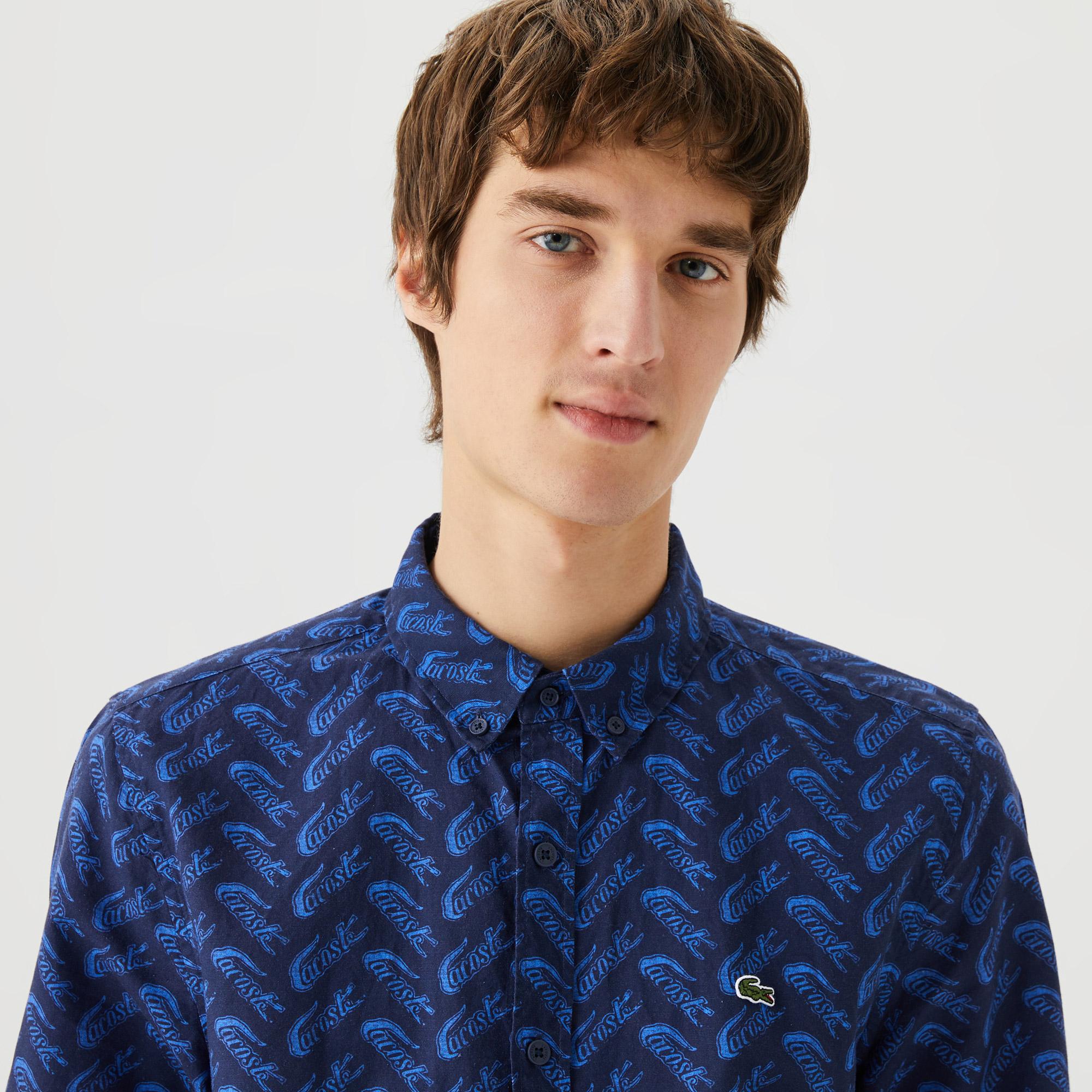 Воротник button-down;\Надпись Lacoste и крокодил по всему изделию;\Дышащая легкая ткань;\Вышитый логотип Lacoste на груди\Материал: 60% хлопок 40% лен\Рост модели 188 см, размер одежды 4