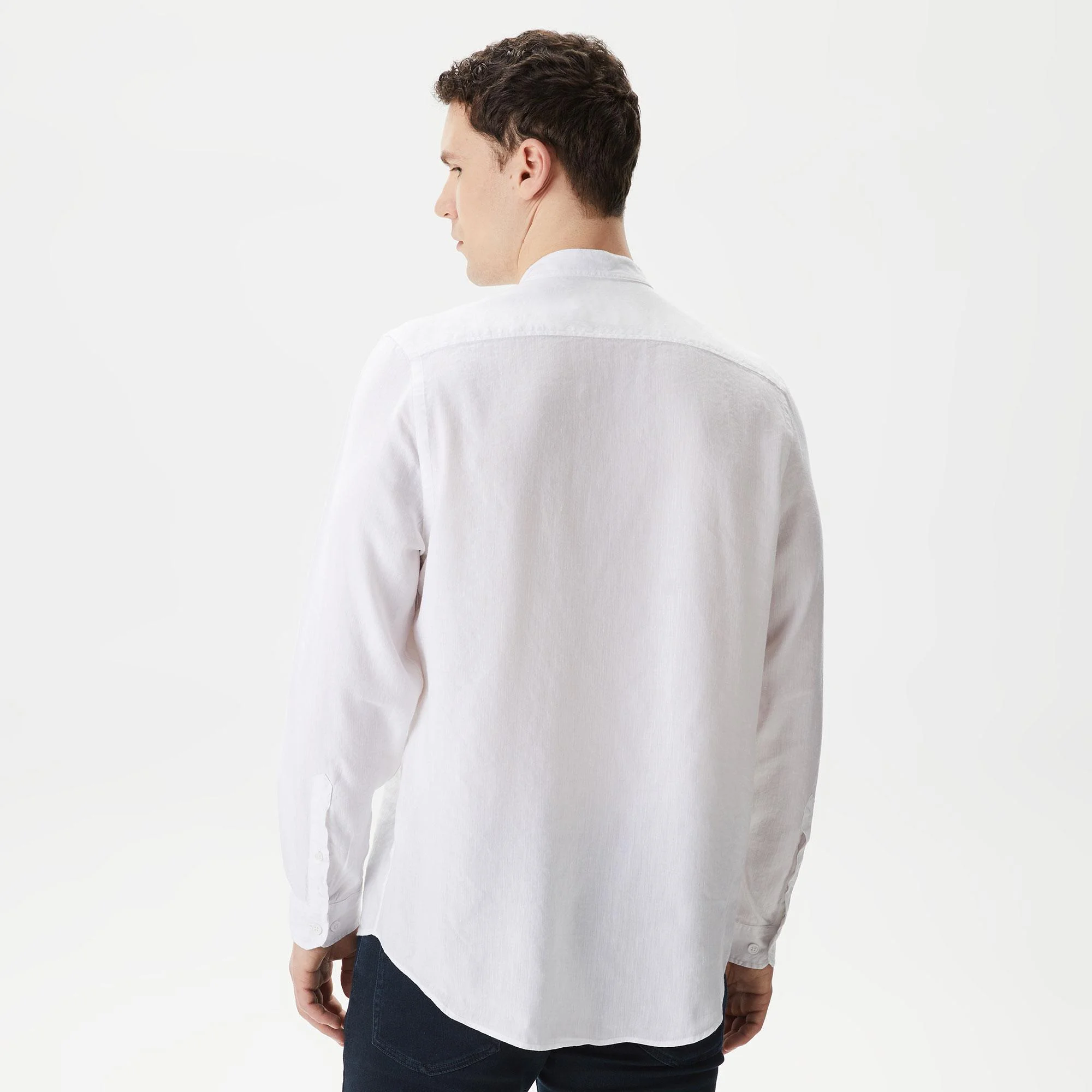 Воротник "Мандарин"\Легкий и дышащий материал\Логотип на груди\Материал: верх-54% лен 46% тенсель\Рост модели 187 см, размер одежды 41