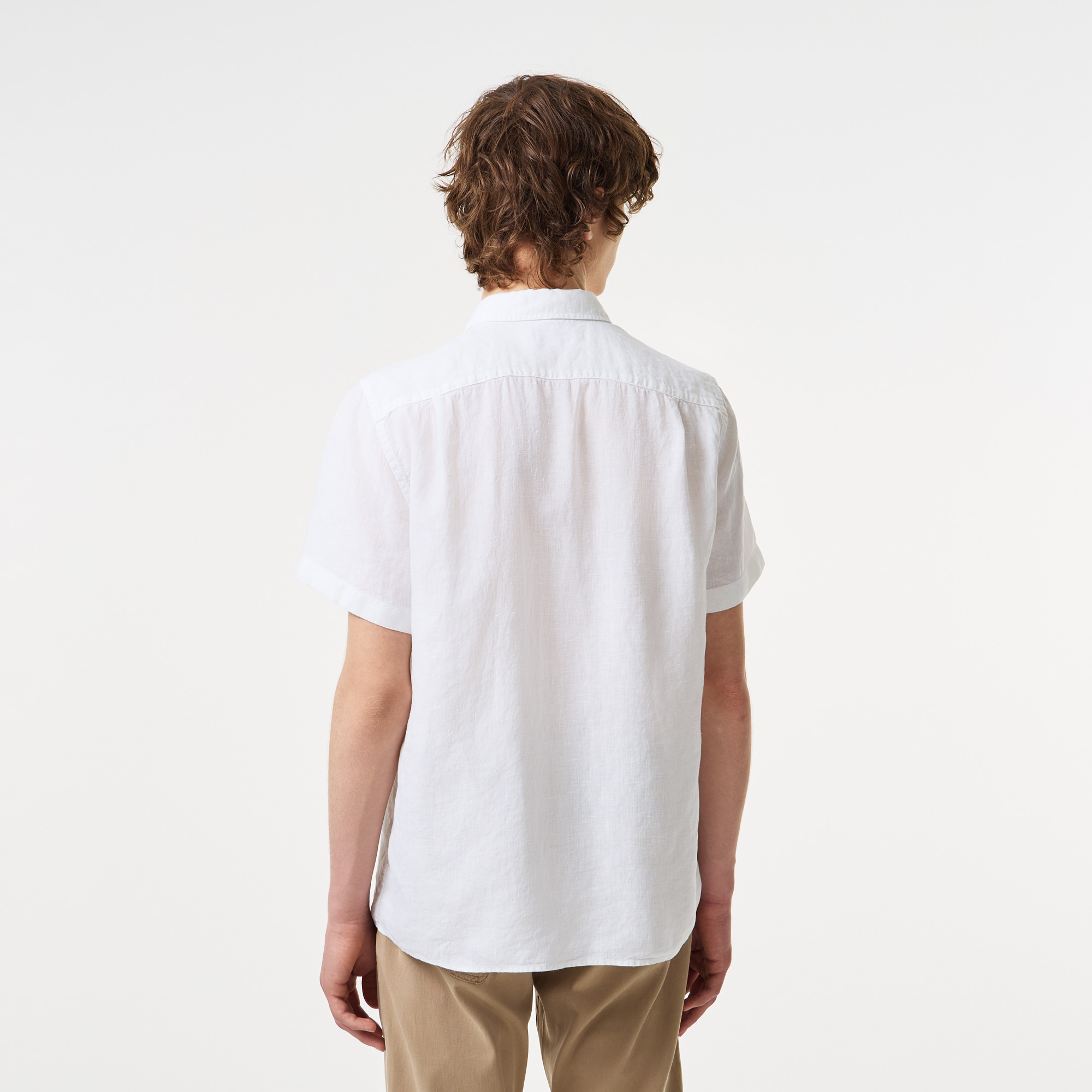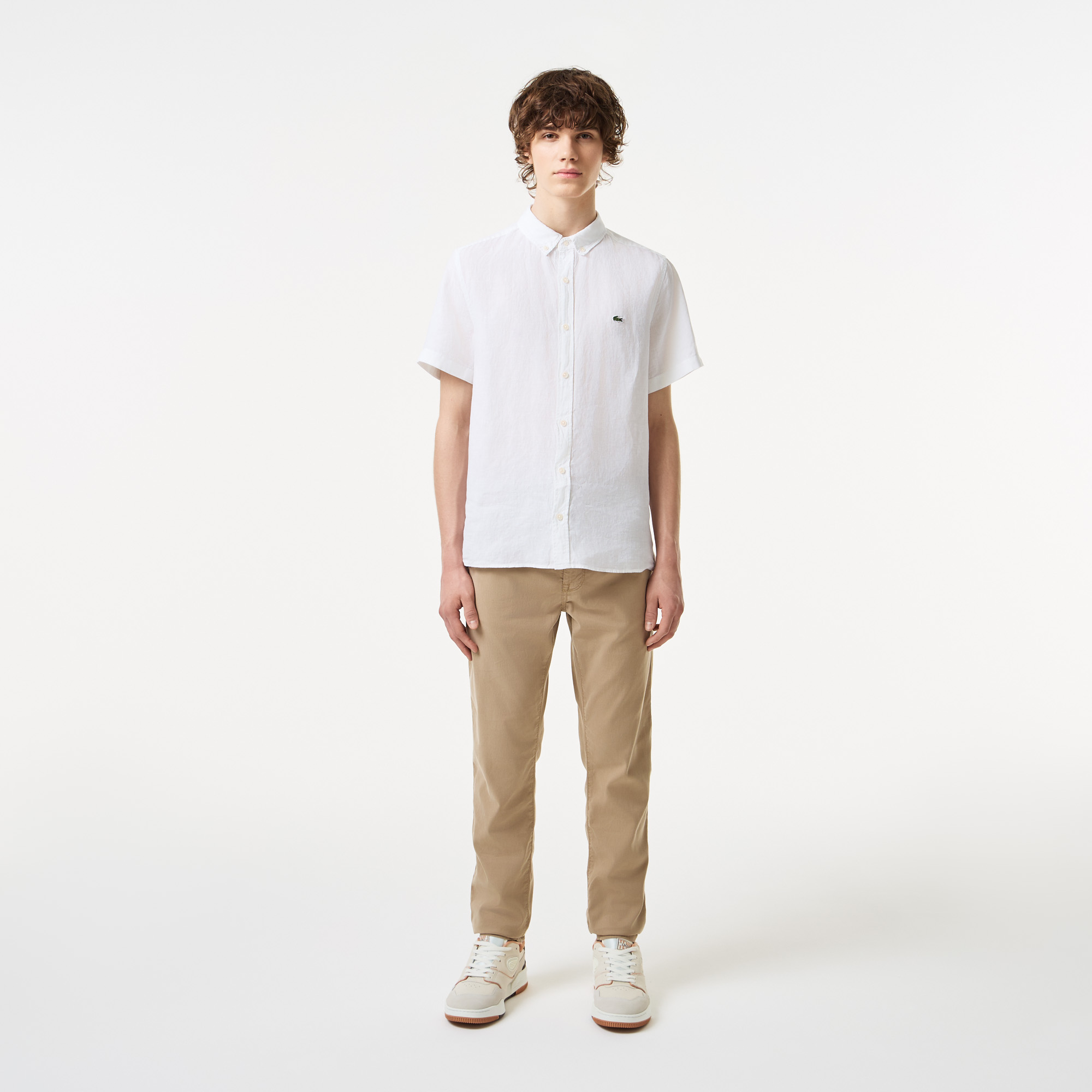 Легкий и дышащий лен\Воротник button-down\Короткие рукава\Накладкой карман на груди\Логотип на груди\Материал: верх-100% лен\Рост модели 187 см, размер одежды 40