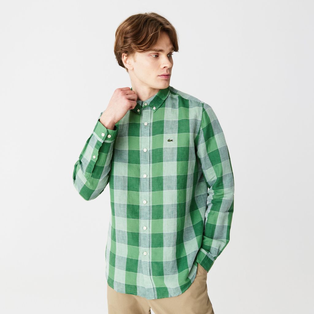 Воротник button-down;\В полоску;\Вышитый логотип Lacoste на груди\Материал: 67% лен 33% хлопок\Рост модели 185 см, размер одежды 4