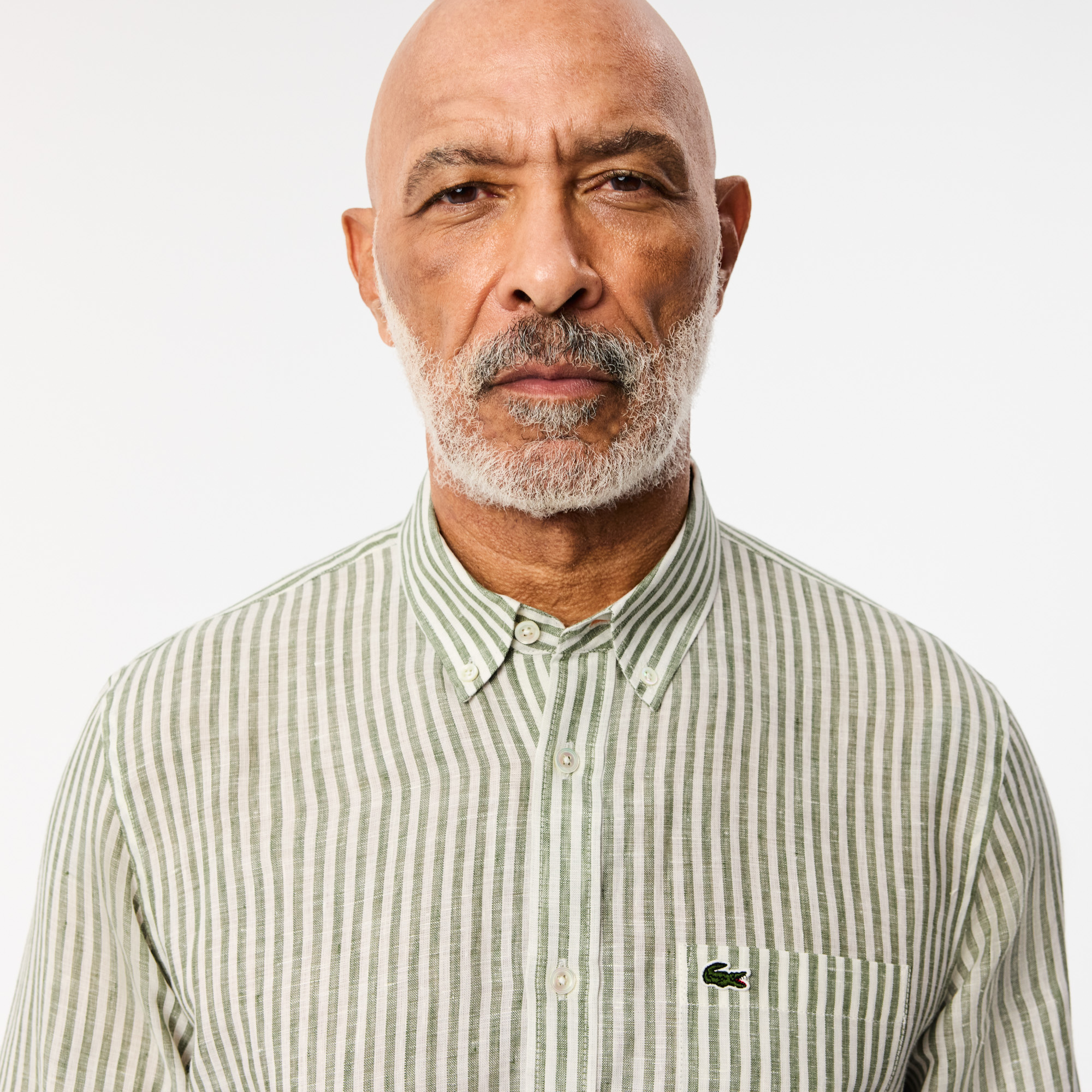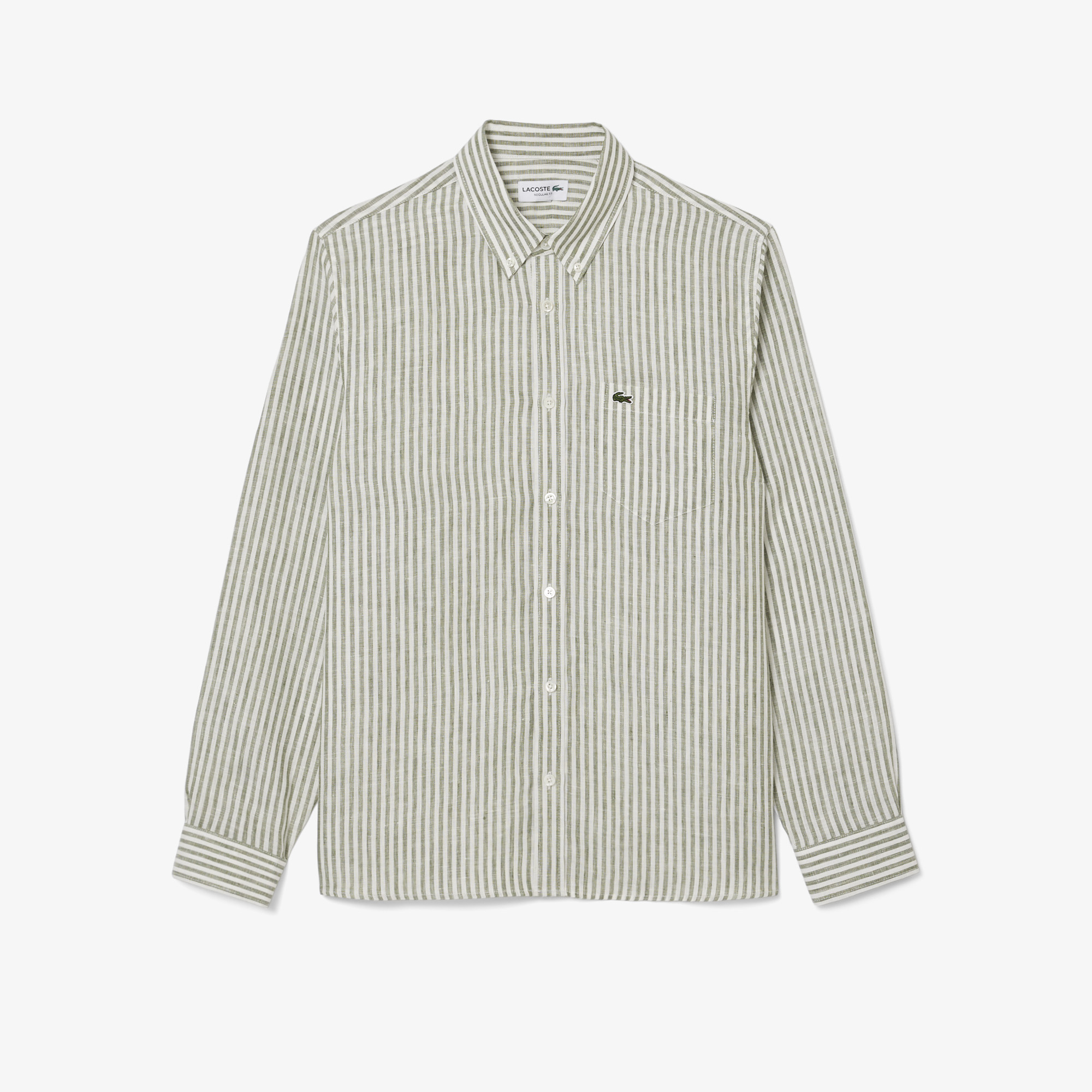 Льняная рубашка в полоску Regular Fit \ Впитывающий, терморегулирующий, гипоаллергенный лен \ Regular fit, прямой крой \ Классический воротник на пуговицах \ Пуговицы из натурального перламутра \ Вышитый логотип на груди \ Воротник button-down\В полоску\