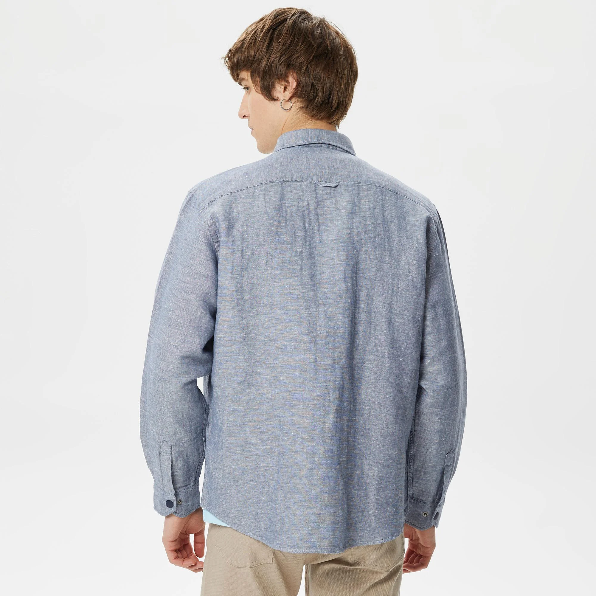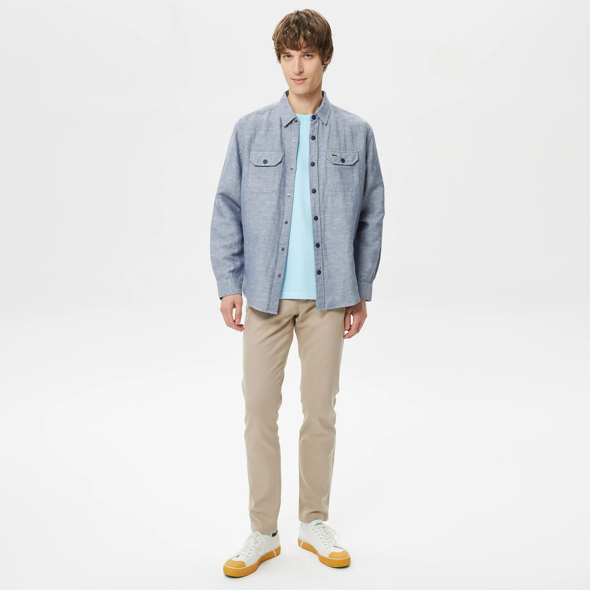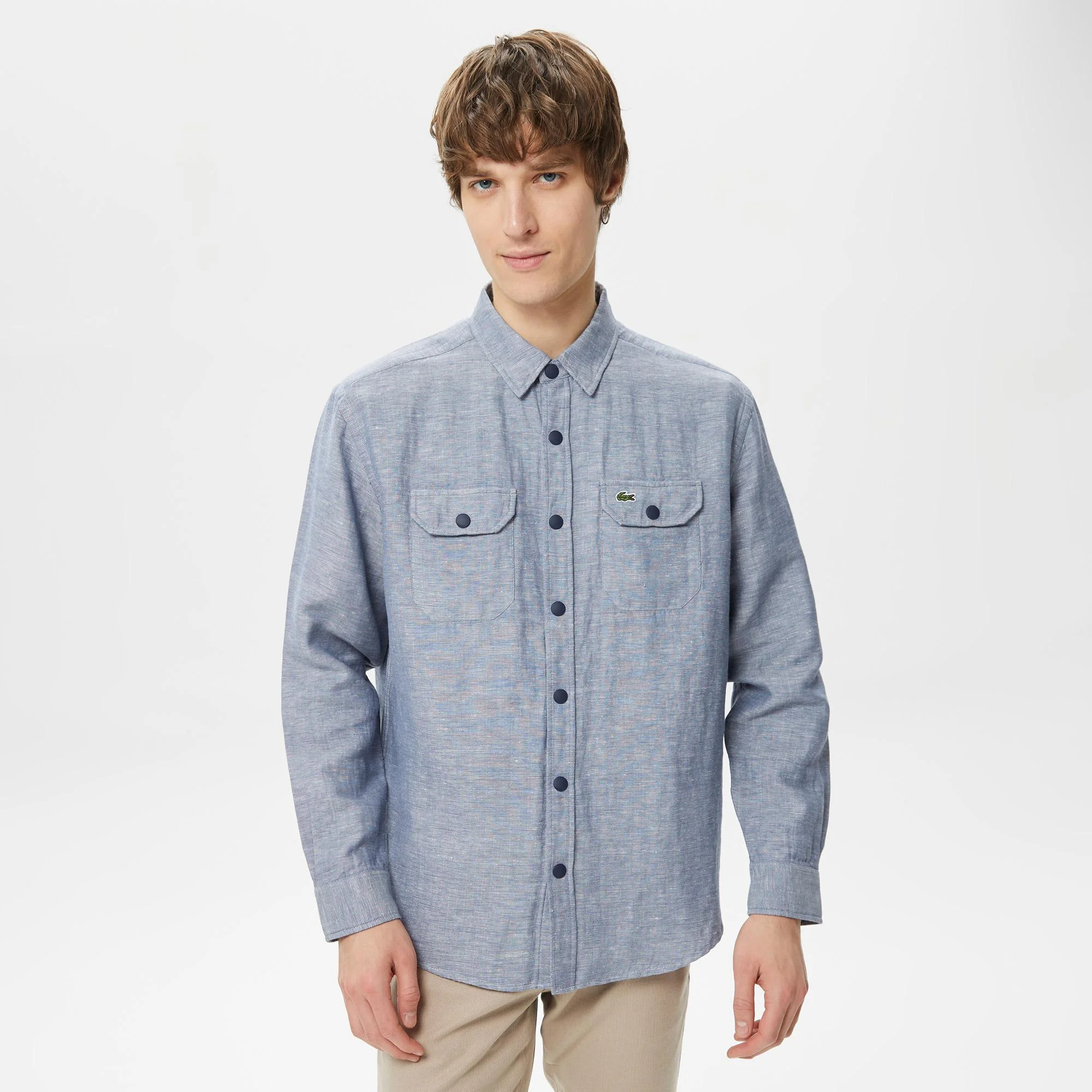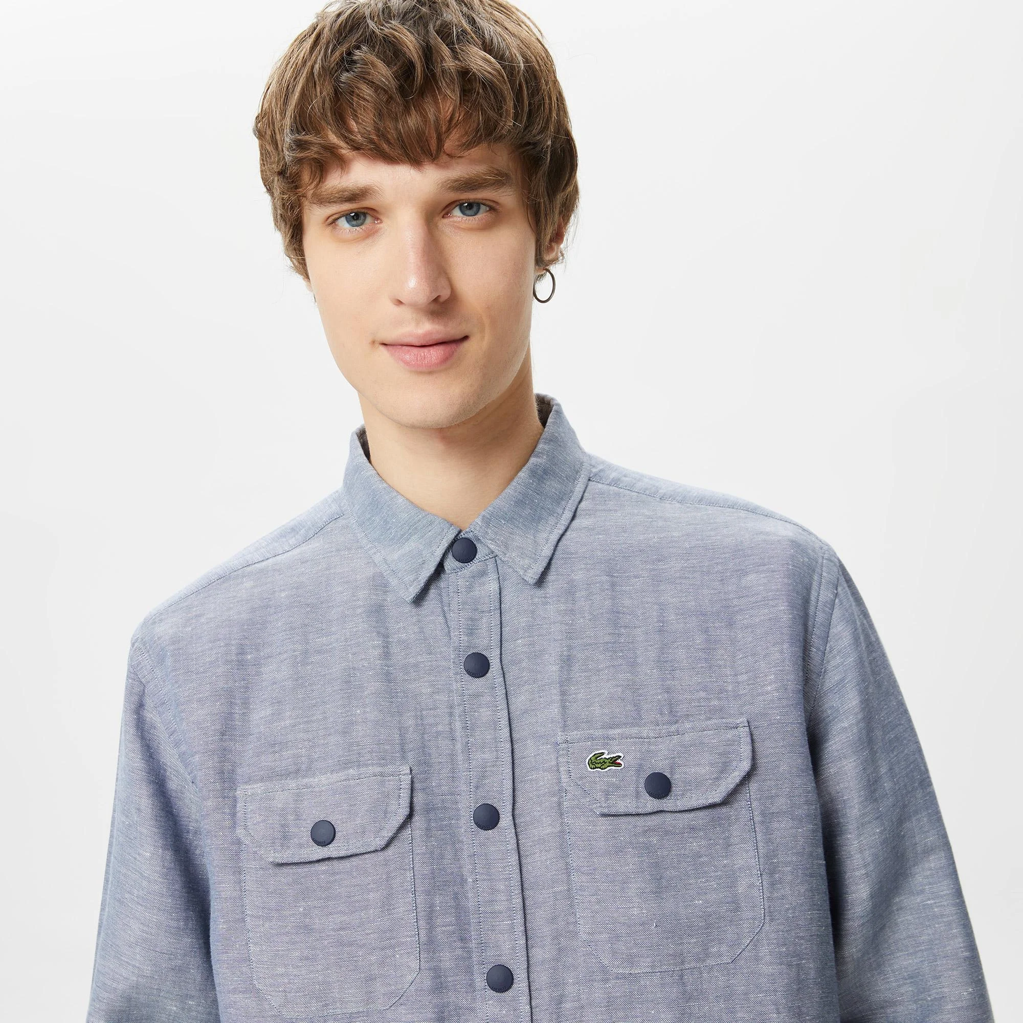 Классический воротник\Карманы с клапаном\Логотип на груди\Материал: 52% лен 48% хлопок\\Рост модели 188 см, размер одежды 40
