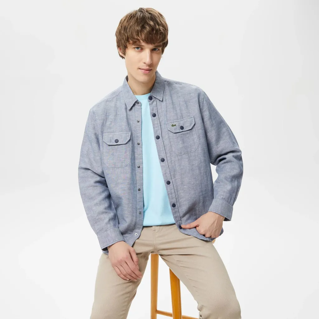 Классический воротник\Карманы с клапаном\Логотип на груди\Материал: 52% лен 48% хлопок\\Рост модели 188 см, размер одежды 40