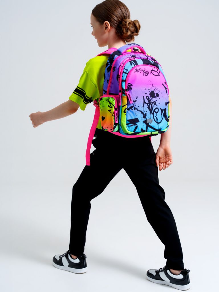 Школьный рюкзак для девочки подростка. Прямые широкие регулируемые лямки с мягкими вкладками и сетчатым покрытием для улучшения вентиляции, 3 основных отделения на молнии, 2 боковых кармана: сетчатый и на молнии. Внутри: 1 отсек: карман на молнии, открытые карманы для канцелярии. 2 отсек: без карманов, 3 отсек: карман для папок, карман на молнии, 2 кармана без замка, карабин для крепления пропуска/пенала/ключей, усиленная спинка, дно и верхняя ручка, спинка и обратная часть плечевых ремней - сетчатые, для улучшенной вентиляции, светоотражающие элементы на переднем кармане и плечевых ремнях. Рюкзак в школу можно дополнить мешком для обуви и пеналом в том же дизайне.