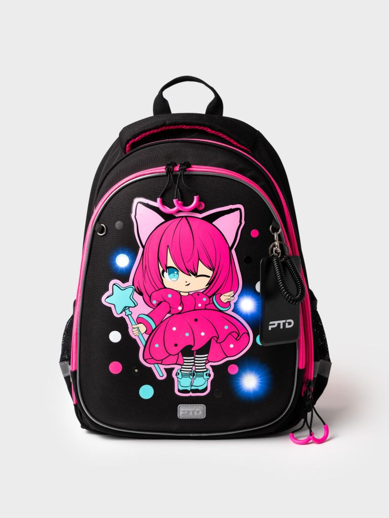 Уникальность дизайна ранца заключается в использовании светодиодных лампочек на передней панели. Формоустойчивый рюкзак с ортопедической спинкой для девочки школьницы. Конструкция ортопедической вентилируемой спинки обеспечивает максимальный комфорт и позволяет снизить нагрузку на спину школьников и дошкольников. Широкие мягкие вентилируемые лямки регулируются по высоте, что делает рюкзак идеальным как для первоклассника, так и для детей из средней школы. Спереди лямки можно закрепить на застежку, чтобы они не спадали. Дно имеет уплотнение. Снизу дна имеются резиновые "ножки", чтобы низ рюкзака не пачкался. Рюкзак имеет два основных отделения на молнии. Внутри имеется несколько отделений и кармашков для систематизации школьных принадлежностей. По бокам есть карманы. У рюкзака есть две ручки: одна - мягкая вентилируемая ручка для ношения в руках, вторая маленькая - для того, чтобы рюкзак можно было вешать на вешалку. Модель выполнена из водонепроницаемой ткани. Рюкзак имеет светоотражающие детали на лямках, по бокам, на переднем отделении, чтобы ребенка было хорошо видно в темноте со всех сторон. В подарок идет пластиковый чехол для пропуска на растягивающейся пружине. Пружина дает возможность спокойно приложить пропуск к турникету не снимая рюкзак. Рюкзак в школу можно дополнить мешком для обуви и пеналом в том же дизайне. Размер рюкзака: 30*39*19 см. Вес рюкзака: 830 гр