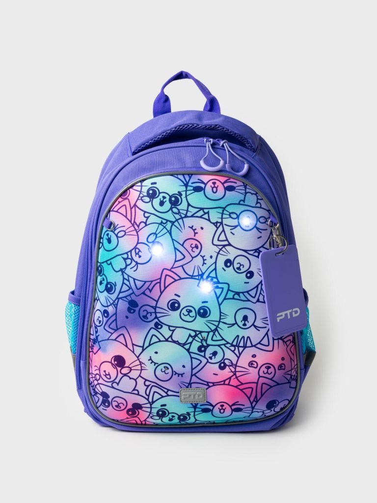 Уникальность дизайна ранца заключается в использовании светодиодных лампочек на передней панели. Формоустойчивый рюкзак с ортопедической спинкой для девочки школьницы. Конструкция ортопедической вентилируемой спинки обеспечивает максимальный комфорт и позволяет снизить нагрузку на спину школьников и дошкольников. Широкие мягкие вентилируемые лямки регулируются по высоте, что делает рюкзак идеальным как для первоклассника, так и для детей из средней школы. Спереди лямки можно закрепить на застежку, чтобы они не спадали. Дно имеет уплотнение. Снизу дна имеются резиновые "ножки", чтобы низ рюкзака не пачкался. Рюкзак имеет два основных отделения на молнии. Внутри имеется несколько отделений и кармашков для систематизации школьных принадлежностей. По бокам есть карманы. У рюкзака есть две ручки: одна - мягкая вентилируемая ручка для ношения в руках, вторая маленькая - для того, чтобы рюкзак можно было вешать на вешалку. Модель выполнена из водонепроницаемой ткани. Рюкзак имеет светоотражающие детали на лямках, по бокам, на переднем отделении, чтобы ребенка было хорошо видно в темноте со всех сторон. В подарок идет пластиковый чехол для пропуска на растягивающейся пружине. Пружина дает возможность спокойно приложить пропуск к турникету не снимая рюкзак. Рюкзак в школу можно дополнить мешком для обуви и пеналом в том же дизайне. Размер рюкзака: 30*39*19 см. Вес рюкзака: 830 гр